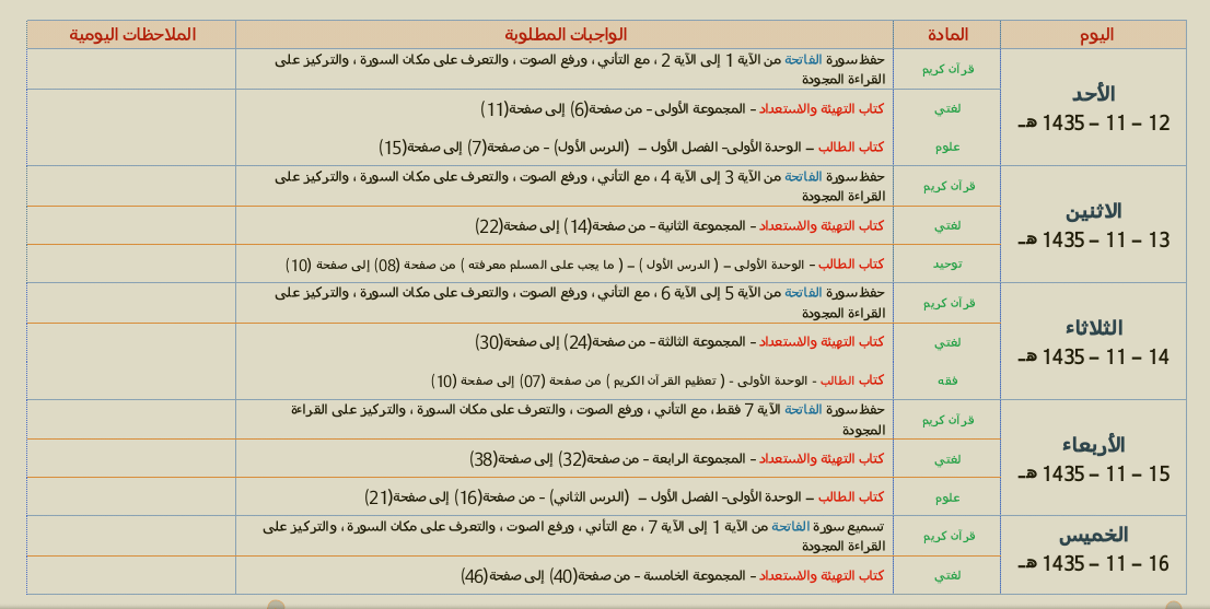 خطة الواجبات الاسبوعية للفترة من 12 الى 16 ذي القعدة لعام 1435 هـ