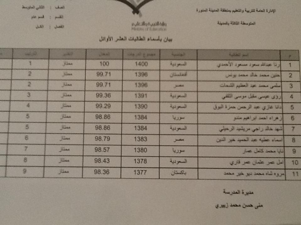 اسماء العشرة الاوائل في جميع المراحل للفصل الدراسي الثاني1434