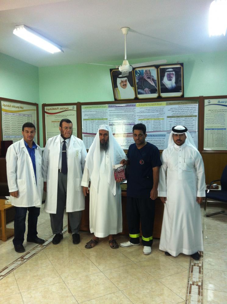قامت الوحدة الصحية المدرسية بمحافظة بدر في يوم الأحد الموافق 16 / 5 / 1433بالإشتراك مع مركز الهلال الأحمر بمحافظة بدر بإقامة دورة للإسعافات الأولية بمدرسة ثانوية سفيان بن ثابت الأنصاري ومتوسطة بن النفيس بالواسطة ( تبعد قرية الواسطة حوالي 20 كلم شرق مدينة بدر ) وذلك في إطار برنامج المدارس المعززة للصحة وقد انتقل فريق الوحدة ( الذي تألف من الأستاذ سامي رجا الله الصبحي مدير الوحدة الصحية و كذلك طبيب الوحدة الصحية و الممرض محمود زكريا سليمان ومساعد الصيدلي عبد الله السهلي الحربي ) إلى المدرسة حيث التقوا هناك مع المسعف عبد الرحيم الأحمد وكان في استقبالهم فضيلة الشيخ / غازي بن حميد الرويثي مدير المدرسة الذي رحب بالفريق ثم اصطحبهم الأستاذ سعود عتيق الصبحي ( المرشد الطلابي والمرشد الصحي ) إلى غرفة مصادر التعلم حيث تواجدت جماعة الصحة بالمدرسة والتي تتألف من طلاب من كل صف وكذلك معلمين . و في البداية قام طبيب الوحدة بإلقاء محاضرة وكذلك تم عرض شرائح داتاشو أعد خصيصا لهذا البرنامج ثم تبعه بعد ذلك المسعف عبد الرحيم الأحمد حيث شمل البرنامج مواضيع عدة منها الإنعاش القلبي الرئوي والـغصة و............إلخ وعقب ذلك تم الندريب العملي على الدمى المحاكية للكبار والصغار ولقد قام مدير الوحدة الصحية وكذلك مندوب الهلال الأحمر بإهداء بعض الكتب الصحية إلى المدرسة . وإليكم بعض الصور الملتقطة خلال تلك الزيارة التعديل الأخير تم بواسطة أحمد صلاح الحفني ; 2012-04-22 الساعة 11:21 AM. |