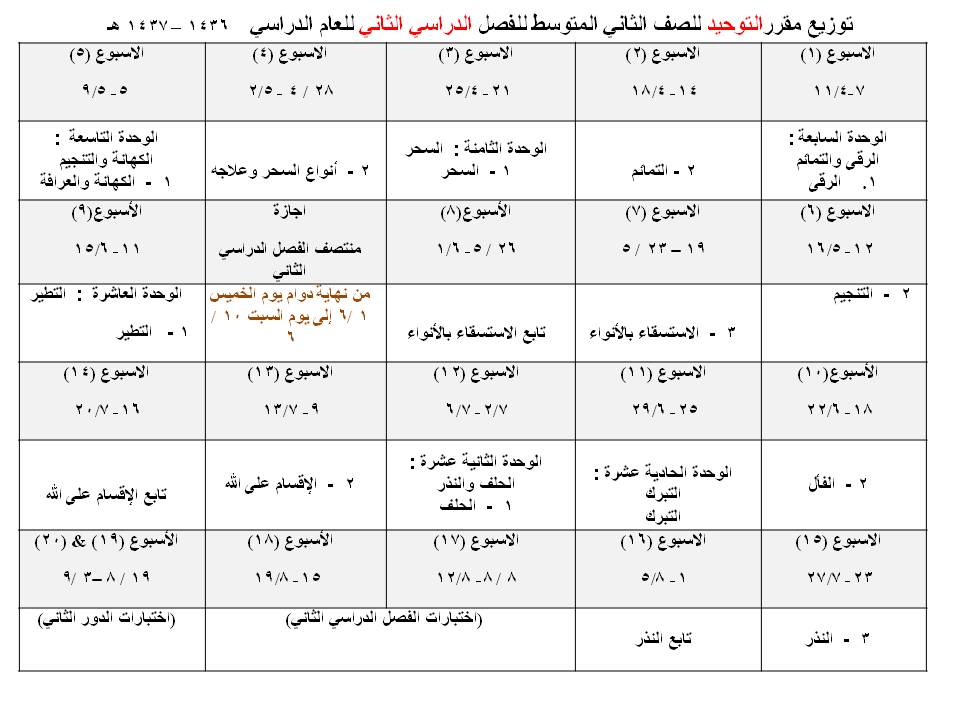 توزيع منهج التوحيد للصف الثاني المتوسط لعام 1437 الفصل الدراسي الثاني |