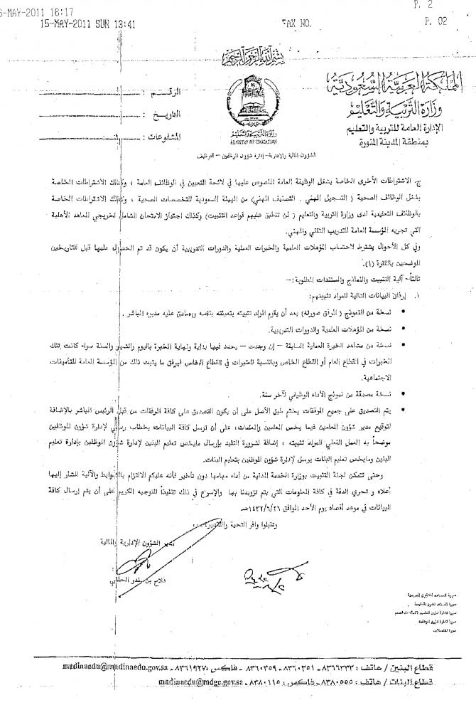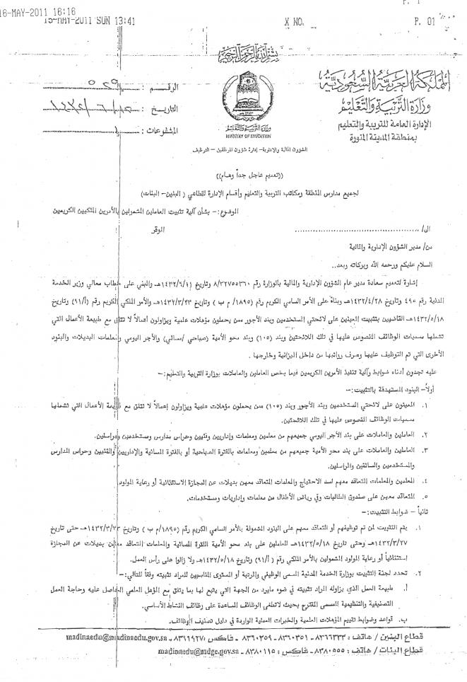 اخيتي وصل الآن للمدارس التعميم الخاص برفع استمارات التثبيت لمعلمات محو الأمية والبديلات وجميع الذين على البنود سواء مستخدمين أو غيره والف مبروك |