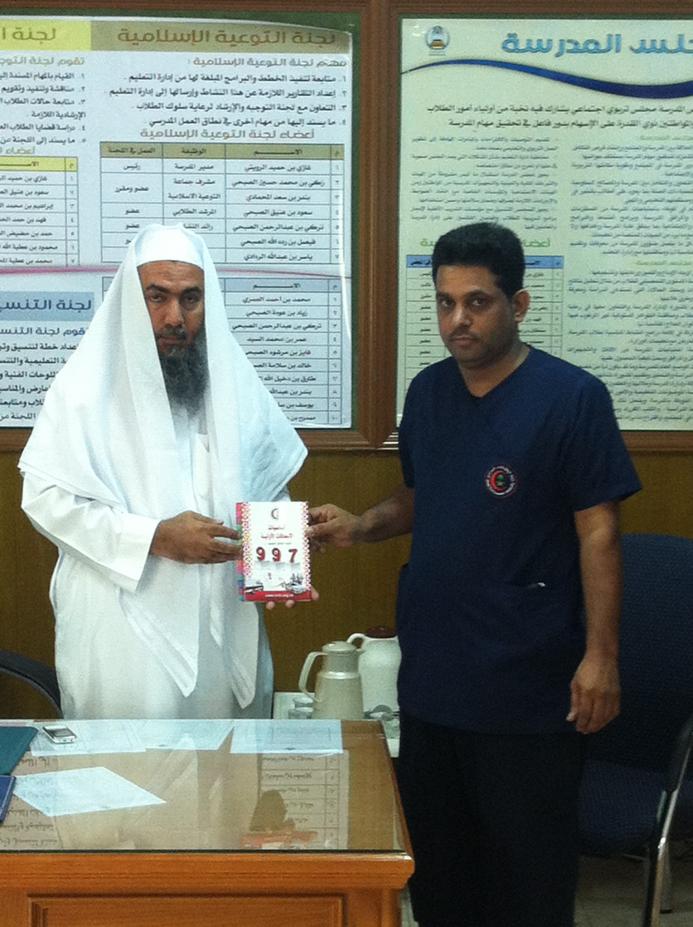 قامت الوحدة الصحية المدرسية بمحافظة بدر في يوم الأحد الموافق 16 / 5 / 1433بالإشتراك مع مركز الهلال الأحمر بمحافظة بدر بإقامة دورة للإسعافات الأولية بمدرسة ثانوية سفيان بن ثابت الأنصاري ومتوسطة بن النفيس بالواسطة ( تبعد قرية الواسطة حوالي 20 كلم شرق مدينة بدر ) وذلك في إطار برنامج المدارس المعززة للصحة وقد انتقل فريق الوحدة ( الذي تألف من الأستاذ سامي رجا الله الصبحي مدير الوحدة الصحية و كذلك طبيب الوحدة الصحية و الممرض محمود زكريا سليمان ومساعد الصيدلي عبد الله السهلي الحربي ) إلى المدرسة حيث التقوا هناك مع المسعف عبد الرحيم الأحمد وكان في استقبالهم فضيلة الشيخ / غازي بن حميد الرويثي مدير المدرسة الذي رحب بالفريق ثم اصطحبهم الأستاذ سعود عتيق الصبحي ( المرشد الطلابي والمرشد الصحي ) إلى غرفة مصادر التعلم حيث تواجدت جماعة الصحة بالمدرسة والتي تتألف من طلاب من كل صف وكذلك معلمين . و في البداية قام طبيب الوحدة بإلقاء محاضرة وكذلك تم عرض شرائح داتاشو أعد خصيصا لهذا البرنامج ثم تبعه بعد ذلك المسعف عبد الرحيم الأحمد حيث شمل البرنامج مواضيع عدة منها الإنعاش القلبي الرئوي والـغصة و............إلخ وعقب ذلك تم الندريب العملي على الدمى المحاكية للكبار والصغار ولقد قام مدير الوحدة الصحية وكذلك مندوب الهلال الأحمر بإهداء بعض الكتب الصحية إلى المدرسة . وإليكم بعض الصور الملتقطة خلال تلك الزيارة التعديل الأخير تم بواسطة أحمد صلاح الحفني ; 2012-04-22 الساعة 11:21 AM. |