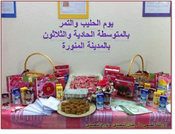 ا[align=center]لحمد لله رب العالمين والصلاة والسلام على سيد العالمين وإمام المرسلين نبينا محمد عليه أزكى الصلاة والسلام أما بعـــــد تزينت زوايا المدرسة المتوسطة االحادية والثلاثون بالمدينة المنورة يوم الثلاثاء الموافق 1434/5/21هـ بفعاليات المهرجان الصحي لللحليب والتمر تم تفعيل البرنامج بعدة طرق ومن خلال برنامج الإفطار الصحي وتم عمل مطويات تبين أهمية الحليب وتم توزيعها على الطالبات وقامت مديرة المدرسة أ / إنعام عبدالله مويس بنفسها بالإشراف عليها وتم توزيع على الطالبات التمر والحليب لهن . وتم توزيع نشرات تثقيفية في كافه أنحاء المدرسة والقيام بعمل العديد من النشاطات الصحية كعمل مسابقة اسئلة صحية عامة ومسابقات للنشاط البدني كالقفز بالحبل والمشي السريع وتوزيع جوائز قيمة تشجيعية للطالبات المشاركات بالفعاليات بإشراف المنسقة الصحية أ / حنان المحمدي أ / نوره المحيمدي |