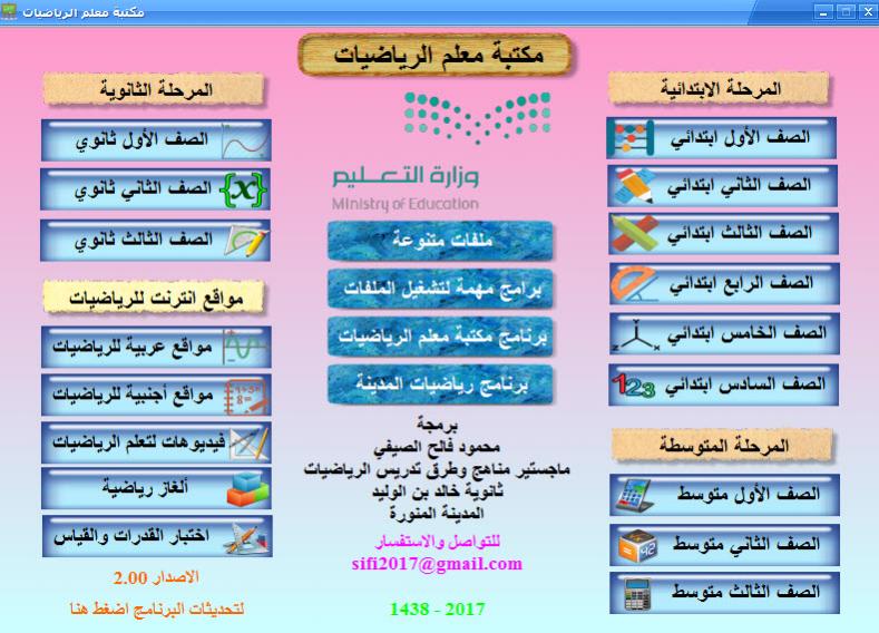 السلام عليكم ورحمة الله وبركاته برنامج مكتبة معلم الرياضيات للكمبيوتر بنظام ويندوز مكتبة معلم الرياضيات لتحميل البرنامج https://www.mediafire.com/folder/cle...8A%D8%A7%D8%AA أو My Files والبرنامج بامتداد exe ولا يحتاج للتثبيت على الكمبيوتر .. والنسخة تستطيع نسخها في فلاش ميموري وتشغيلها على أي جهاز كمبيوتر يعمل بنظام الويندوز بدون الحاجة إلى التثبيت معلومات عن البرنامج تم تجميع الكثير من الملفات بالمكتبة وتحوي كل ما يحتاجه المعلم من ملفات مساعدة يمكنك اختيار المرحلة الدراسية والصف الدراسي بسهولة وتحميل ملفات الفصلين الدراسيين الأول والثاني أو ملفات كل وحدة و باب والملفات الموجودة تستطيع استعراضها بالكمبيوتر للتعديل عليها أو طباعتها جميع الملفات مرفوعة على موقع ميديا فاير المشهور وبروابط مباشرة بدون الدخول لصفحة التحميل تحوي المكتبة على العديد من الملفات ومنها * تحاضير لجميع المراحل مع الأهداف * توزيع للمنهج تستطيع فيه حذف التواريخ السابقة وكتابة تواريخ جديدة * كشوف وسجلات متابعة للطلاب * أوراق عمل وواجبات وحلول * ملخصات ودفاتر وشروحات * اختبارات قصيرة ونهائية * برامج وألعاب * عروض بوربوينت وفيديوهات * كتاب الطالب والتمارين ودليل المعلم وتوفر نسخ متعددة (للسنوات السابقة) * كتب أخرى مفيدة ومناهج لدول عربية من الأفضل تحميل ملف الخطوط وذلك لتفادي ظهور بعض الأخطاء في عرض الملفات التي تعتمد على الخطوط وهناك تطبيقات أخرى من تصميم نفس المبرمج .. وتعمل على الجوالات بنظام أندرويد التطبيق الأول : مكتبة معلم الرياضيات (نسخة للجوالات بنظام أندرويد) https://play.google.com/store/apps/d...fi2017.MAKTABA التطبيق الثاني: رياضيات المدينة (نسخة للجوالات بنظام أندرويد) https://play.google.com/store/apps/d...11.madina_math وفق الله الجميع لما يحبه ويرضاه |