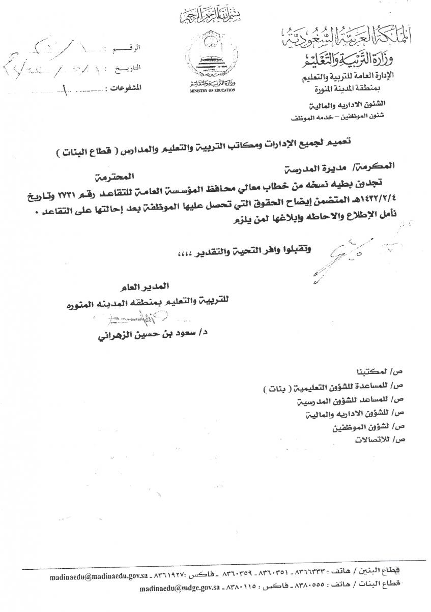 الله يحفظك انتظر منك رقم التعميم الصادر من تعليم المدينة ابحث عنه في الادارة