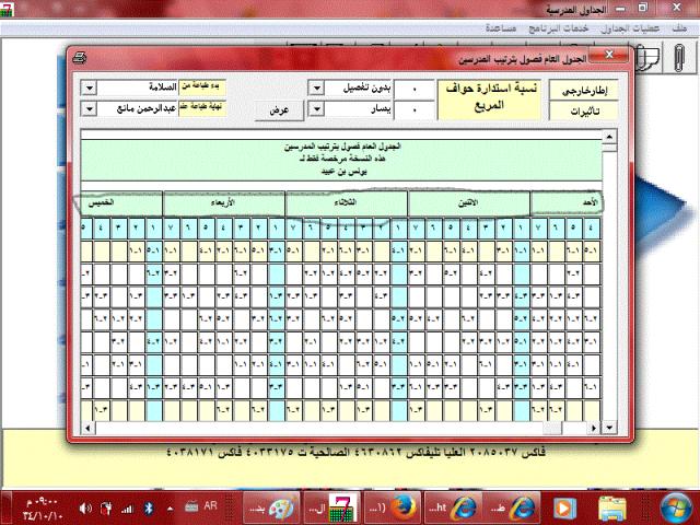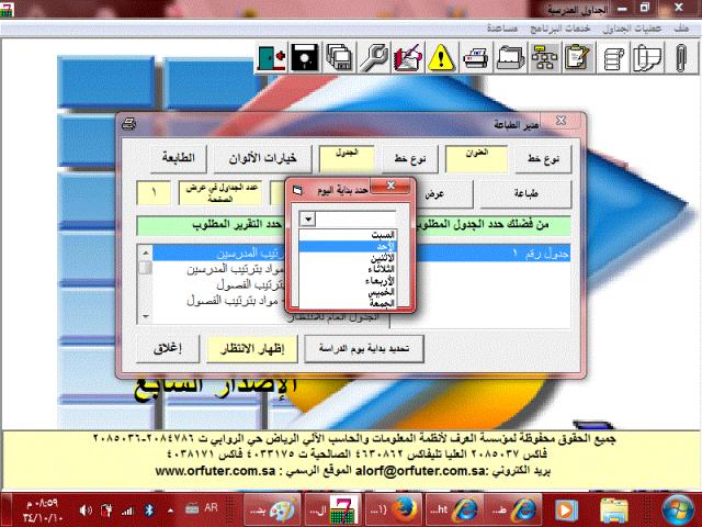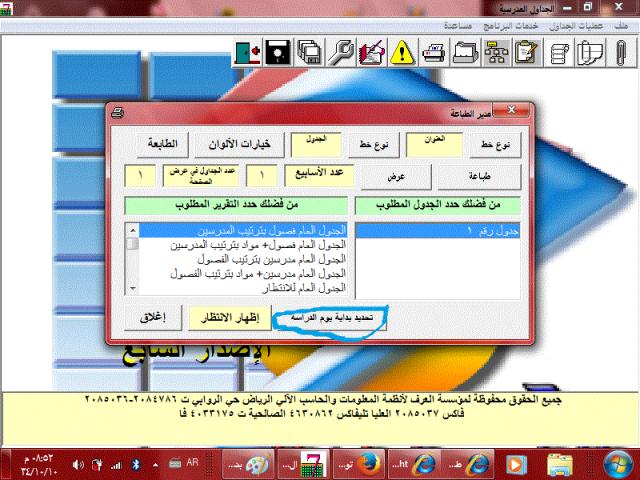 السلام عليكم ورحمة الله وبركاته وبعد يمكنك اضافة الخميس لجداول العرف لتبدأ الاسبوع من الأحد الى الخميس بدون اضافة اي برامج فالحل موجود بنفس البرنامج وهو.. كالتالي: اعمل جدولك كالسابق تماما من السبت الى الأربعاء وبعد الانتهاء من التعديل والاضافة وتسجيل جميع الاسنادات تذهب للطباعة ستجد مربع اسفل تحديد بداية يوم الدراسة اضغط عليه واختر الأحد بعدها استعرض جدولك ستجده من الأحد الى الخميس... الشرح من خلال الصور في المرفقات,, أعداد الأستاذ\\ابو عبد الله جزاه الله خير الجزاء |