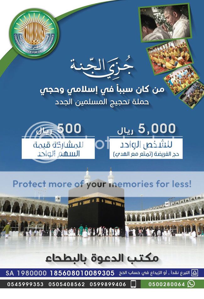 بسم الله الرحمن الرحيم أكفل حاج ليكون لك بإذن الله مثل أجر حجته وأجر صلاتة وكل عمله هناك بإذن الله وتذكر ان العمل هناك مضاعف فكل ركعة يركعها هي ب100 ألف ركعة وسيقضي الحاج هناك أسبوع ولك مثل أجره بإذن الله وهذا مقطع بصوت الشيخ العلامة محمد بن عثيمين رحمه الله يقول أن من كفل حاجا فله مثل أجره https://www.youtube.com/watch?v=d-d_...ature=youtu.be http://i814.photobucket.com/albums/z...d.jpg~original تنبيه مهم جدا : كفالة حاج لاتغني عن الحج الفريضة فإذا كنت لم تحج قبل الآن فيجب ان تحج ولاتغني هذه الكفالة عن حجك الفريضة ================== أولا : كفالة حاج في المكتب التعاوني للدعوة والإرشاد ودعوة الجاليات بالجبيل ================== تكلفة الحاج الواحد 4500 ريال http://i814.photobucket.com/albums/z...8.jpg~original للأتصال والأستفسار / 0507805009 للتبرع في حساب الراجحي الخاص بالحج (حساب رسمي باسم المكتب وسيخرج لك أسم المكتب على شاشة الصراف) 146608010000276 وللتبرع من أي بنك آخر ( الآيبان ) SA1580000146608010000276 ================== ثانيا : كفالة حاج في المكتب التعاوني للدعوة والإرشاد ودعوة الجاليات بالبطحاء في الرياض ================== تكلفة الحاج الواحد 5000 ريال قيمة السهم لكفالة الحاج 500 ريال http://i814.photobucket.com/albums/z...8.jpg~original للأتصال والأستفسار / جوال / 0545999353 جوال / 0505408562 جوال / 0599899406 واتساب / 0500280064 للتبرع في حساب الراجحي الخاص بالحج (حساب رسمي باسم المكتب وسيخرج لك أسم المكتب على شاشة الصراف) 185608010089305 وللتبرع من أي بنك آخر ( الآيبان ) SA1980000185608010089305 ================== ثالثا : كفالة حاج في المكتب التعاوني للدعوة والإرشاد ودعوة الجاليات بجنوب الدمام (غراس ) ================== تكلفة الحاج الواحد 5000 ريال http://i814.photobucket.com/albums/z...z.jpg~original للأتصال والأستفسار / جوال / 0556670505 جوال / 0502245566 للتبرع في حساب الراجحي خاص بالحج (حساب رسمي باسم المكتب وسيخرج لك أسم الجمعية على شاشة الصراف) 104608014300805 وللتبرع من أي بنك آخر ( الآيبان ) SA3180000104608014300805 ================== رابعا : كفالة حاج في المكتب التعاوني للدعوة والإرشاد ودعوة الجاليات بالبديعة ================== تكلفة الحاج الواحد 5000 ريال http://i814.photobucket.com/albums/z...4.jpg~original للأتصال والأستفسار / 0500547472 0500121144 للتبرع في حساب الراجحي خاص بالحج (حساب رسمي باسم المكتب وسيخرج لك أسم الجمعية على شاشة الصراف) 282608010224227 وللتبرع من أي بنك آخر ( الآيبان ) SA5780000282608010224227 ساعدونا في نشر الموضوع في المنتديات والأيميلات والقروبات والدال على الخير كفاعله فلا تدري كم سيكفل من حاج بسبب نشرك |