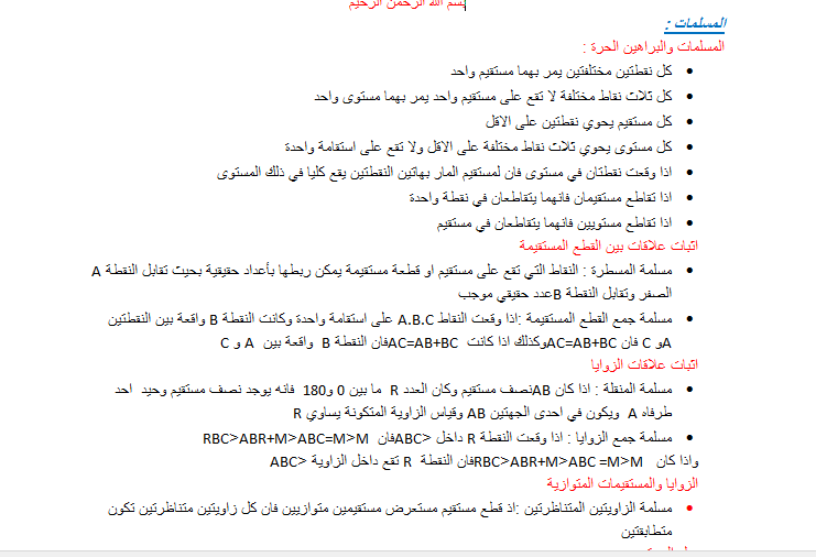 أوراق أعمال مسلمات ونظريات مرحله ثانوي جديد 1441هـ \ 2020م نموذجين WORD + pdf تحميل مرفقات WORD + pdf بسم الله الرحمن الرحيم http://up.r7il.com/do.php?img=151 المسلمات : المسلمات والبراهين الحرة : كل نقطتين مختلفتين يمر بهما مستقيم واحد كل ثلاث نقاط مختلفة لا تقع على مستقيم واحد يمر بهما مستوى واحد كل مستقيم يحوي نقطتين على الاقل كل مستوى يحوي ثلاث نقاط مختلفة على الاقل ولا تقع على استقامة واحدة اذا وقعت نقطتان في مستوى فان لمستقيم المار بهاتين النقطتين يقع كليا في ذلك المستوى اذا تقاطع مستقيمان فانهما يتقاطعان في نقطة واحدة اذا تقاطع مستويين فانهما يتقاطعان في مستقيم اثبات علاقات بين القطع المستقيمة مسلمة المسطرة : النقاط التي تقع على مستقيم او قطعة مستقيمة يمكن ربطها بأعداد حقيقية بحيث تقابل النقطة A الصفر وتقابل النقطة Bعدد حقيقي موجب مسلمة جمع القطع المستقيمة :اذا وقعت النقاط A.B.C على استقامة واحدة وكانت النقطة B واقعة بين النقطتين Aو C فان AC=AB+BCوكذلك اذا كانت AC=AB+BCفان النقطة B واقعة بين A و C اثبات علاقات الزوايا مسلمة المنقلة : اذا كان ABنصف مستقيم وكان العدد R ما بين 0 و180 فانه يوجد نصف مستقيم وحيد احد طرفاه A ويكون في احدى الجهتين AB وقياس الزاوية المتكونة يساوي R مسلمة جمع الزوايا : اذا وقعت النقطة R داخل <ABCفان M<ABC=M<ABR+M<RBC واذا كان M<ABC =M<ABR+M<RBCفان النقطة R تقع داخل الزاوية <ABC الزوايا والمستقيمات المتوازية مسلمة الزاويتين المتناظرتين :اذ قطع مستقيم مستعرض مستقيمين متوازيين فان كل زاويتين متناظرتين تكون متطابقتين ميل المستقيم يكون للمستقيمين غير راسيين الميل نفسه اذا فقط واذا كانا متوازيين يكون المستقيمين الغير راسيين متعامدين اذا وفقط اذا كان حاصل ضرب ميليهما يساوي -1 اثبات توازي المستقيمات اذا قطع قاطع مستعرض مستقيمين في مستوى وكانت الزوايا المتناظرة متطابقة فان المستقيمين متوازيين مسلمة التوازي : اذ علم مستقيم ونقطة لا تقع عليه فان هناك مستقيما واحد يمر يتلك النقطة ويوازي المستقيم المعلوم اثبات التطابق : حالتي SSSوSAS مسلمة التطابق بثلاثة اضلاع : اذا تطابقت اضلاع مثلث مع اضلاع مثلث اخر فان المثلثين متطابقين بحالة SSS مسلمة التطابق بـ ضلع-زاوية –ضلع :اذا تطابق ضلعان وزاوية محصورة بينهما مع نظائرها في المثلث الاخر فان المثلثين متطابقين بحالة SAS اثبات التطابق حالتي AAS.ASA مسلمة التطابق بزاوية –ضلع زاوية :اذا تطابقت زاويتان وضلع محصور بينهما مع نظائرهما في المثلث الاخر فان المثلثين متطابقين ASA التطابق في المثلثات القائمة الزاوية التطابق بساق وتر :اذا تطابق وتر وساق في مثلث قائم الزاوية مع نظائرها في المثلث اخر قائم الزاوية فان المثلثين متطابقين النظريات : المسلمات والبراهين الحرة : نظرية نقطة المنتصف :اذا كانت m نقطة منتصف AB فان AM=BM اثبات علاقات بين القطع المستقيمة خواص تطابق القطع المستقيمة : يحقق تطابق القطع المستقيمة خاصية الانعكاس والتماثل والتعدي اثبات علاقات الزوايا : نظرية تكامل الزوايا : اذا كانت زاويتان متجاورتان على مستقيم فانهما متكاملتان نظرية تتام الزوايا : اذا شكل ضلعان غير المشتركين لزاويتين متجاورتين زاوية قائمة فان الزاويتان متتامتان تحقق علاقة تطابق الزوايا خاصية الانعكاس والتماثل والتعدي الزاويتان المكملتان لزاوية نفسها او لزاويتين متطابقتين تكونان متطابقتين الزاويتان المتممتان لزاوية نفسها او لزاويتين متطابقتين تكونان متطابقتين نظرية الزوايا المتقابلة بالراس : الزاويتان المتقابلتان بالراس متطابقتان نظريات الزوايا القائمة تتقاطع المستقيمات المتعامدة وتشكل اربع زوايا قوائم جميع الزوايا القوائم متطابقة تشكل المستقيمات المتعامدة زوايا متجاورة ومتطابقة اذا كانت زاويتان متطابقتين ومتكاملتين فانهما قائمتان اذا كانت زاويتان متطابقتان ومتجاورتين على مستقيم فانهما قائمتان الزوايا والمستقيمات المتوازية الزاويتان الداخليتان المتبادلتان : اذا قطع مستقيم مستعرض مستق