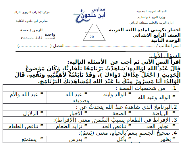 تمارين الوحدة الثانيه الصف الرابع إبتدائي جديد 1441هـ \ 2020م نموذجين WORD + pdf