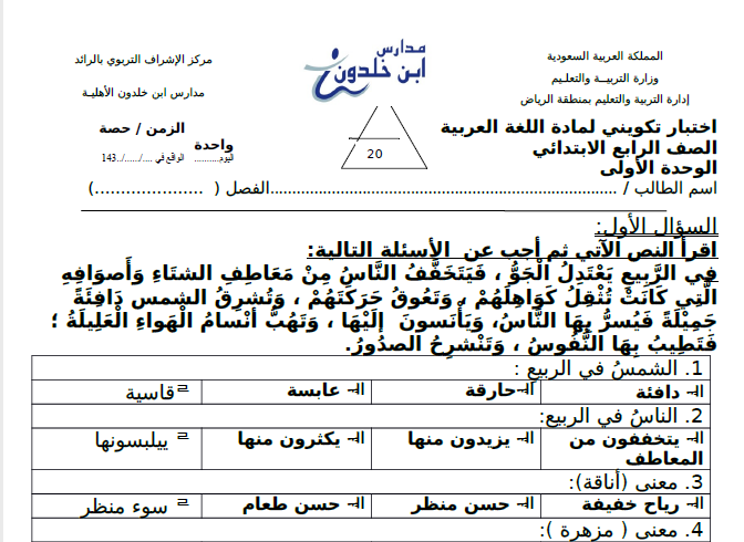 تمارين الوحدة الأولي الصف الرابع إبتدائي جديد 1441هـ \ 2020م نموذجين WORD + pdf