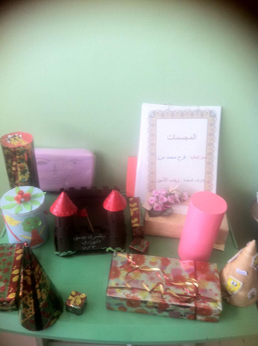 عند دراسة فصل الأشكال الهندسية وفي درس المجسمات طبقت مشروع أطلقت عليه إسم ( أتعلم الرياضيات بنفسي ) وهو أن تصنع الطالبة مجسمات وتتعرف عليها وتصفها من حيث عدد الأوجه والأحرف والرؤوس فأبدعت طالبتي بتصميم مجسمات ودمى رائعة استخدمن فيها أدوات بسيطة وعلب متوفرة في كل مكان ...