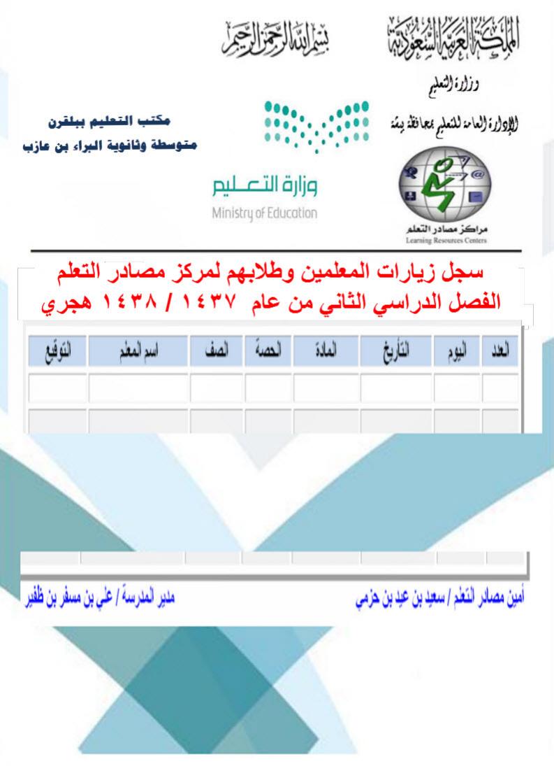 | جدول الزيارات الصفية لمركز مصادر التعلم للفصل الدراسي الأول لعام1434-1435هـ | كلي تفاؤل و أمل | قسم تقنيات واستراتيجيات التعلم | 2 | 2013-10-27 11:20 AM |
