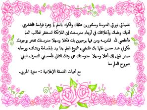 | ترحيب | سمو الحربي | المتوسطة السادسة والأربعون الرائدة (46) بالمدينة المنورة | 1 | 2012-04-01 01:30 PM |