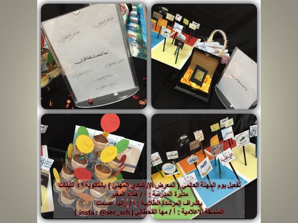 تم تنظيم برنامج ومعرض لطالبات الصف الثالث ثانوي بقسميه العلمي والأدبي بمناسبة يوم المهنة العالمي وذلك في بداية يوم الخميس الموافق 30 / 4 / 1435 هـ