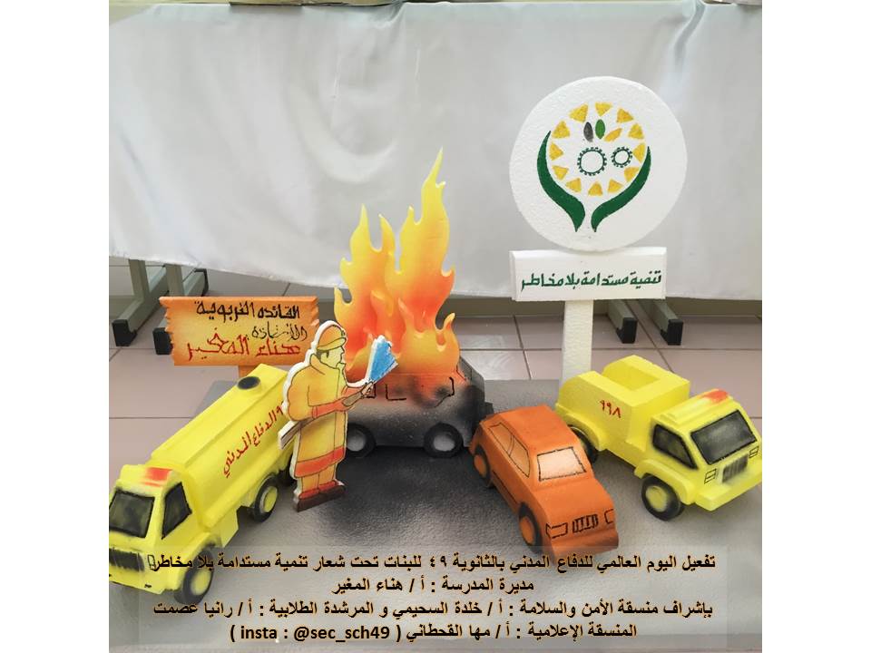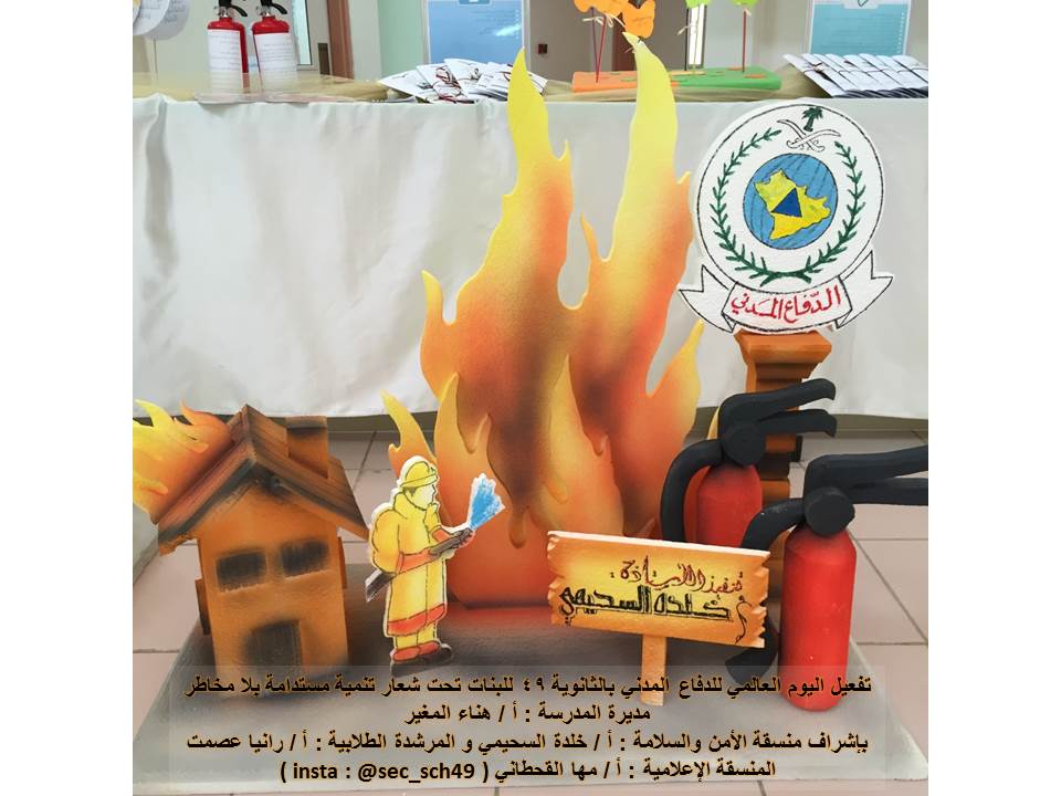 بسم الله الرحمن الرحيم السلام عليكم ورحمة الله وبركاته أما بعد بمناسبة إقامة اليوم العالمي للدفاع المدني تحت شعار ( تنمية مستدامة بلا مخاطر ) والذي من فعالياته مشاركة المدارس بأنشطة مختلفة في مجال السلامة نرسل لكم هذا التقرير الذي يوضح لكم مشاركات مدرستنا الثانوية التاسعة والأربعون للبنات في هذا البرنامج : 1- الإعلان عن تفعيل اليوم العالمي للدفاع المدني تحت شعار ( تنمية مستدامة بلا مخاطر ) في أرجاء المدرسة ليتسنى للطالبات المشاركة في البرنامج . 2 - عمل برنامج لتفعيل اليوم العالمي للدفاع المدني تحت شعار ( تنمية مستدامة بلا مخاطر ) وذلك في يوم الأربعاء الموافق 6 / 5 / 1436 هـ وقد احتوى البرنامج على : ا - عروض فيديو عن ( سلامة المنازل – السلامة في المعامل – السلامة في العمل – السلامة في المختبرات – السلامة الحقيقية وهو الفوز بالجنة ) . ب - توزيع مطويات تخدم موضوع السلامة . ج - عمل مسابقات لتفعيل اليوم العالمي للدفاع المدني د - إعداد ركن يحتوي على مطويات وإرشادات ونشرات ونماذج لطفايات الحريق تحتوي على طريقة عمل كل نموذج ومجسمات 3 - تفعيل برنامج إذاعي في الإذاعة الصباحية عن اليوم العالمي للدفاع المدني في اليوم التالي الخميس 7 / 5 / 1436 هـ . 4 - المشاركة في المعرض المقام في إدارة الأمن والسلامة بمناسبة هذا اليوم بإرسال المجسمات وبعض النماذج . تم هذا العمل بمشاركة مجموعة من الطالبات من مراحل مختلفة بإشراف منسقة الأمن والسلامة في المدرسة الأستاذة خلدة السحيمي و المرشدة الطلابية الأستاذة رانيا عصمت ختاما : نتمنى أن ينال إعجابكم واستحسانكم هذا والله الموفق .... المنسقة الإعلامية : أ / مها القحطاني |