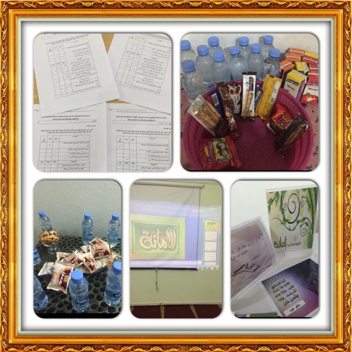 نفذت وحدة التوعية الإسلامية (المصلى) بإشراف الأستاذة عائشة الرحيلي في المتوسطة 61 برنامجاً عن الأمانه في أسبوعه الأول وقد كان البرنامج شاملاً لدرس (معنى الأمانة ومكانتها في المصلى) واستبانه وموقفا افتعاليا وشمل ايضاً ملصقات عن الأمانه ومشاركة إذاعية. |