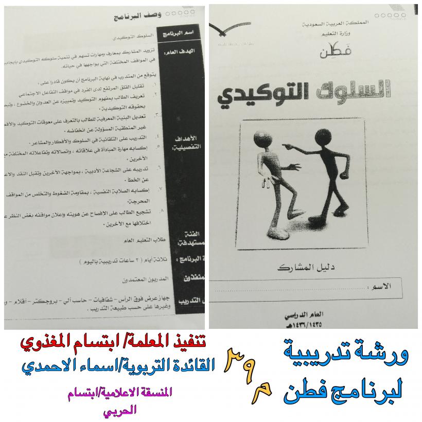 بسم الله الرحمن الرحيم بدأت المتوسطة 39 اليوم الاحد الموافق 1437/2/24 بتفعيل برنامج فطن حيث اقامت منسقة البرنامج المعلمة/ ابتسام المغذوي بعقد ورشة تدريبية عن السلوك التوكيدي لطالبات الصف الثاني متوسط ماتم انجازة في البرنامج/ -تعريف الطالبات بمفهوم السلوك التوكيدي بدقة . -الفرق بين السلوك التوكيدي والعدواني والمذعن. -المقصود بالتأكيد الايجابي والسلبي -سلوكيات مهارة السلوك التوكيدي . - المقصود بالجسارة الاجتماعية . - عرض انشطة فردية وجماعية للطالبات عن مهارة( اطلب ولا تتردد-لاتقل نعم وانت تريد ان تقول لا) -عرض مشاهد ارشادية . المنسقة الاعلامية / ابتسام الحربي |