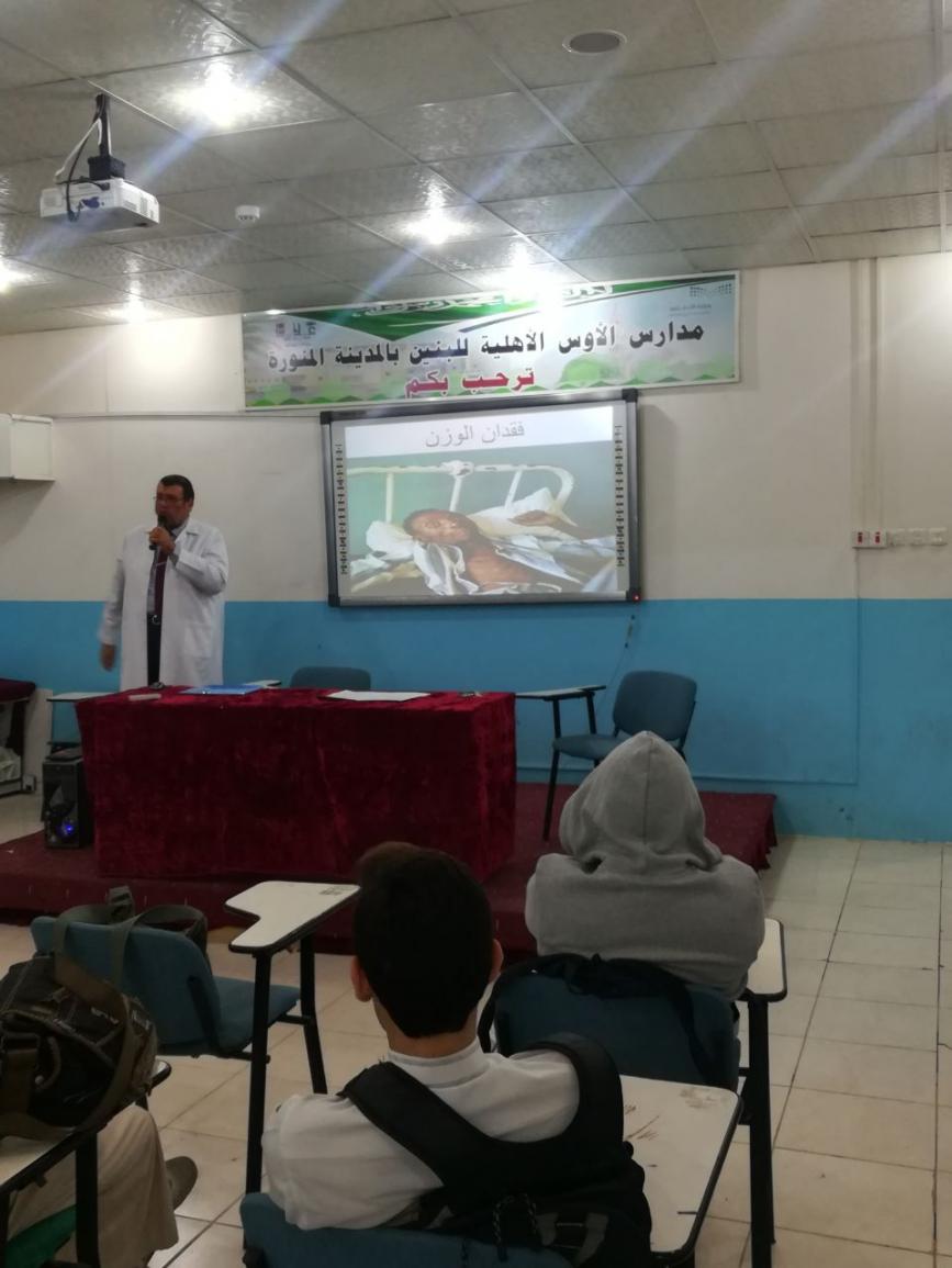 تم بحمد الله اليوم زيارة مجمع مدارس الأوس الاهلية بمراحلها الثلاث حيث تم مراجعة البيئة المدرسية ومعاينة المقاصف ثم التوعية الصحية حيث ألقيت محاضرة على طلاب الصف الثالث الثانوى عنوانها " الإيدز طاعون العصر " وذلك بمناسبة اليوم العالمي لمرض الإيدز والذي يحل في كل عام في اليوم الأول من شهر ديسمبر حيث تم الشرح مع تقديم عرض داتا شو اشتمل على التعريف بالمرض والفيروس المسبب له ومراحل المرض ووسائل العدوى به وطرق الوقاية منه وما هو العلاج الذي يمكن تقديمه حتى الآن والآثار الصحية والنفسية والمادية والاجتماعية للمرض ومعاناة المرضى من الوصمة والعزلة وبيان وجوب تصحيح نظرة المجتمع لهؤلاء المرضى والتعاون والتعاطف معهم كما تم بيان أسباب الوقوع في فاحشة الزنا التي تعد السبب الرئيس لهذا المرض ووسائل الوقاية منها . ولقد قمت برفع عرض الإيدز على النت لمن يرغب من الزملاء وهذا رابط التحميل AIDS.pptx - FileFactory |