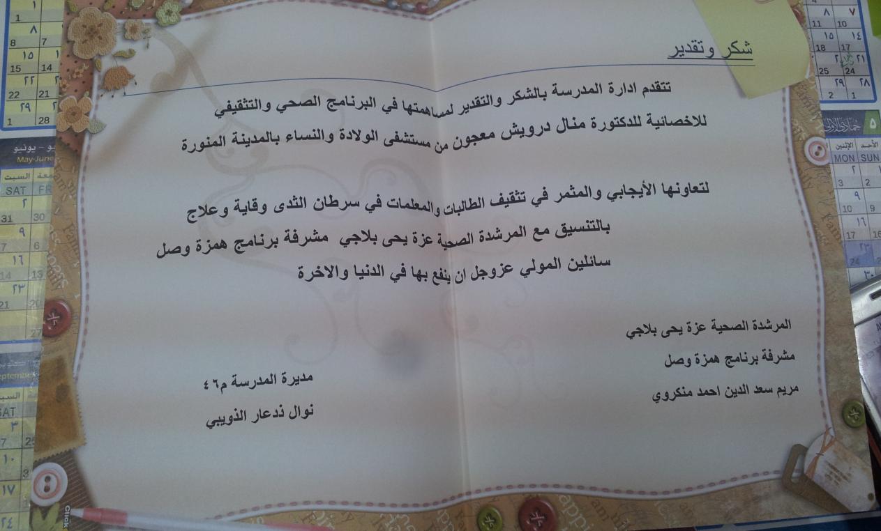 | برنامج توعوي عن سرطان الثدي | نونا 14 | ثانوية العاقول الأولى | 3 | 2013-01-31 06:27 PM |