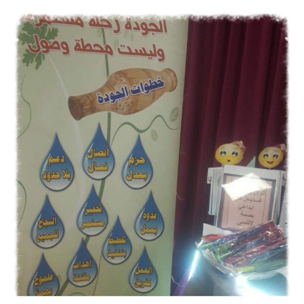 بسم الله الرحمن الرحيم تم ولله الحمد تفعيل يوم الجوده العالمي ل 1438في مدرسه ابتدائيه الابناء بحضور مديره المدرسه الاستاذه الفاضله / نبيله احمد ومعلمات المدرسه وطالباتها ومشرفات الجوده أ/ سعاد اللهيبي وأ/ عواطف اللهيبي واشتمل الحفل على عروض تعريف بالجوده واهميته في حياه الفرد والمجتمع .ومسابقات .واناشيد . وفي نهايه الحفل تم توزيع هدايا على الطالبات ..... المنسقه الاعلاميه مريم الصبحي |