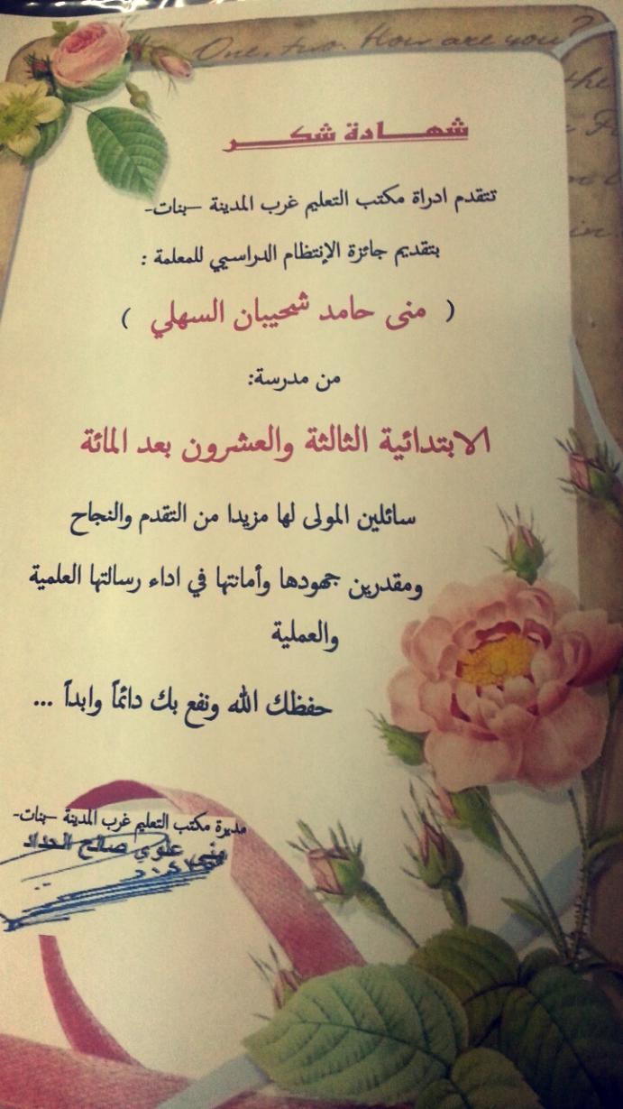 تم تكريم المعلمه:. أ / منى السهلي بجائزة الانتظام المدرسي من مكتب غرب المدينة المنورة لعدم تغيبها طوال العام الدراسي فشكرا لكي استاذتي الفاضلة وكما تم تكريم جميع الطالبات اللآتي لم يتغيبن طوال العام الدراسي و تقديم شهادة شكر وتقدير بجائزة الأنتظام المدرسي لهن . كما تم تكريم المعلمات من قبل القائدة التربوية :. أ / بدرية العوفي وذلك لجهودهن في فعاليات الأسبوع التمهيدي للطالبات الصف (الأول .الثالث.الرابع ) معلمات الصف الأول :. أ /مريم عبدالله المحمادي أ / ليلى خليف الأحمدي . معلمة الصف الثالث :. أ / منيره محمد العوفي . ومعلمة الصف الرابع:. أ / عائشه بخيت الصاعدي . والمرشدة الطلابية :. أ. نوال الرحيلي على جهودها في أستقبال جميع الطالبات في الاسبوع التمهيدي.: . . والمعلمه :. أ .أمل الحاسري على جهودها في حال عدم تواجد مديرة المدرسة . . تكريم مرفق به شهادات شكر وتقدير , والشكر موصول لجميع منسوبات المدرسة ب 122لجهودهن ![]() ![]() . ,المنسقه الأعلامية :. فاطمة الشهري التعديل الأخير تم بواسطة المدرسة123 ; 2015-10-06 الساعة 10:50 PM. |