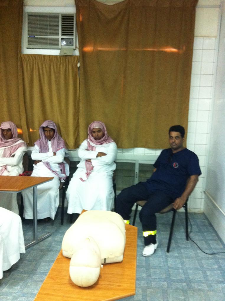 قامت الوحدة الصحية المدرسية بمحافظة بدر في يوم الأحد الموافق 16 / 5 / 1433بالإشتراك مع مركز الهلال الأحمر بمحافظة بدر بإقامة دورة للإسعافات الأولية بمدرسة ثانوية سفيان بن ثابت الأنصاري ومتوسطة بن النفيس بالواسطة ( تبعد قرية الواسطة حوالي 20 كلم شرق مدينة بدر ) وذلك في إطار برنامج المدارس المعززة للصحة وقد انتقل فريق الوحدة ( الذي تألف من الأستاذ سامي رجا الله الصبحي مدير الوحدة الصحية و كذلك طبيب الوحدة الصحية و الممرض محمود زكريا سليمان ومساعد الصيدلي عبد الله السهلي الحربي ) إلى المدرسة حيث التقوا هناك مع المسعف عبد الرحيم الأحمد وكان في استقبالهم فضيلة الشيخ / غازي بن حميد الرويثي مدير المدرسة الذي رحب بالفريق ثم اصطحبهم الأستاذ سعود عتيق الصبحي ( المرشد الطلابي والمرشد الصحي ) إلى غرفة مصادر التعلم حيث تواجدت جماعة الصحة بالمدرسة والتي تتألف من طلاب من كل صف وكذلك معلمين . و في البداية قام طبيب الوحدة بإلقاء محاضرة وكذلك تم عرض شرائح داتاشو أعد خصيصا لهذا البرنامج ثم تبعه بعد ذلك المسعف عبد الرحيم الأحمد حيث شمل البرنامج مواضيع عدة منها الإنعاش القلبي الرئوي والـغصة و............إلخ وعقب ذلك تم الندريب العملي على الدمى المحاكية للكبار والصغار ولقد قام مدير الوحدة الصحية وكذلك مندوب الهلال الأحمر بإهداء بعض الكتب الصحية إلى المدرسة . وإليكم بعض الصور الملتقطة خلال تلك الزيارة التعديل الأخير تم بواسطة أحمد صلاح الحفني ; 2012-04-22 الساعة 11:21 AM. |