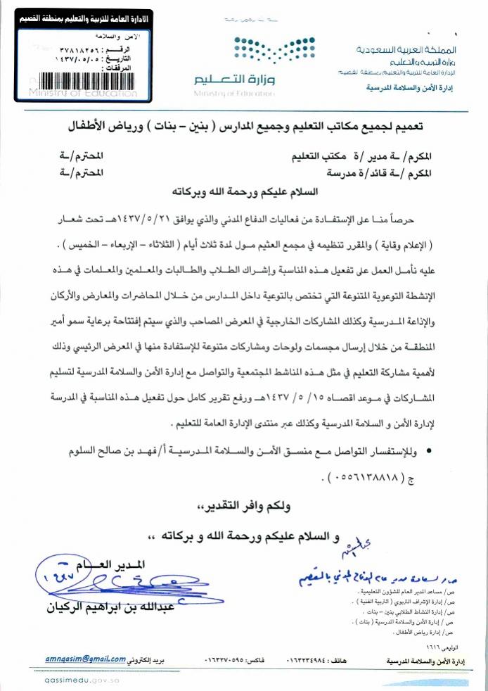 السلام عليكم ورحمة الله وبركاته تعميم + شعار اليوم العالمي للدفاع المدني ( الإعلام...وقاية ) 1437هـ 2016م. للفائدة اليوم العالمي للدفاع المدني 2016 (الإعلام .. وقاية ) اليوم العالمي للدفاع المدني 2016 (الإعلام .. وقاية ) |