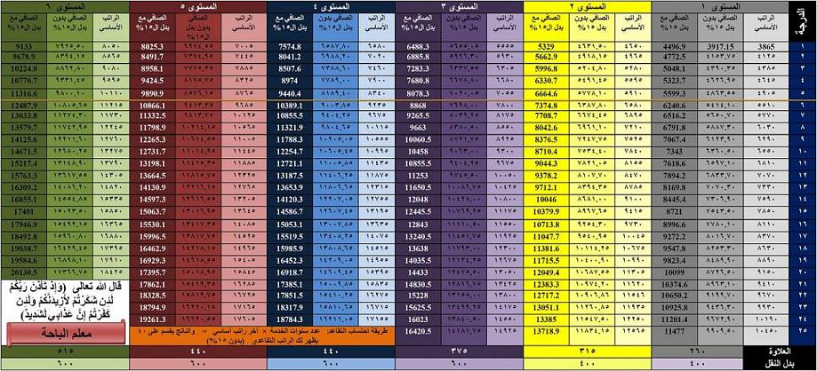 التربوي على المستوى الخامس براتب قدره 8025 ريال غير التربوي على المستوى الرابع براتب قدره 7574 ريال وبالمرفق جدول يبيّن المستويات والمستحقات بالتفصيل ![]() بالتوفيق |