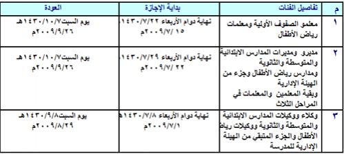 اما معلمات الصفوف الابتداية فيكون مع المتوسط والثانوى اى بنهايية دوام 22-7-1430 هجري هذا والله اعلم |