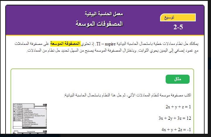 استخدم الالة الحاسبة المعربة TI-Nspire CX لحل هذا النشاط للصف الثاني الثانوي - الفصل الدراسي الاول - صفحة 93 اسم الدرس : توسع 5-2 معمل الحاسبة البيانية المصفوفات الموسعة نفذ هذا النشاط باستخدام الالة الحاسبة المعربة TI-nspire cx تابعونا على صفحتنا الخاصة بهذه التقنية على موقع Facebook اسم الصفحة: حلول التعليم في المملكة العربية السعودية |