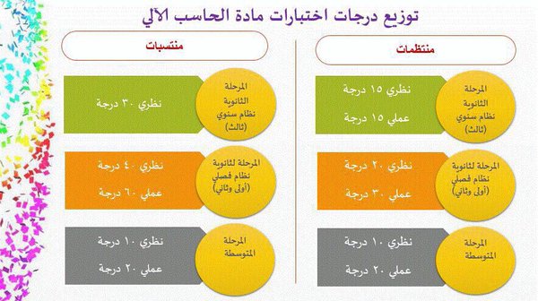 السلام عليكم ورحمة الله وبركاته توزيع درجات الأختبار لمادة الحاسب انتظام وانتساب للمرحلة المتوسطة + الثانوي مقررات + فصلي + سنوي 1437هـ / 2016م ![]() ![]()  |
