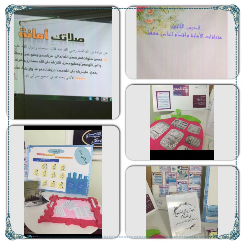حول مشروع الأمانة التي تنفذه الأستاذة عائشة الرحيلي لوحدة التوعية الإسلامية المصلى فقد تم تنفيذ ورشة العمل الأولى مع بعض الفصول وكذلك تفعيل حملة (صلاتي أمانه) وذلك من خلال تنفيذ الطالبات للوحات حائطية وملصقات وعرض مقطع فيديو عن صلاتي أمانة وكان الدرس الثاني معنوناً بمتعلقات الأمانه وأقسام الناس بها وأعدت الأستاذة عائشة جزاها الله خيراً إذاعة وافية عن جوارحك أمانة ووطنك أمانة |