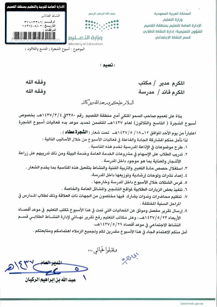 تعميم + أذاعة + مطويات + عبارات إرشادية + عروض بوربوينت بمناسبة أسبوع الشجرة ( التاسع والثلاثون ) للعام 1437هـ