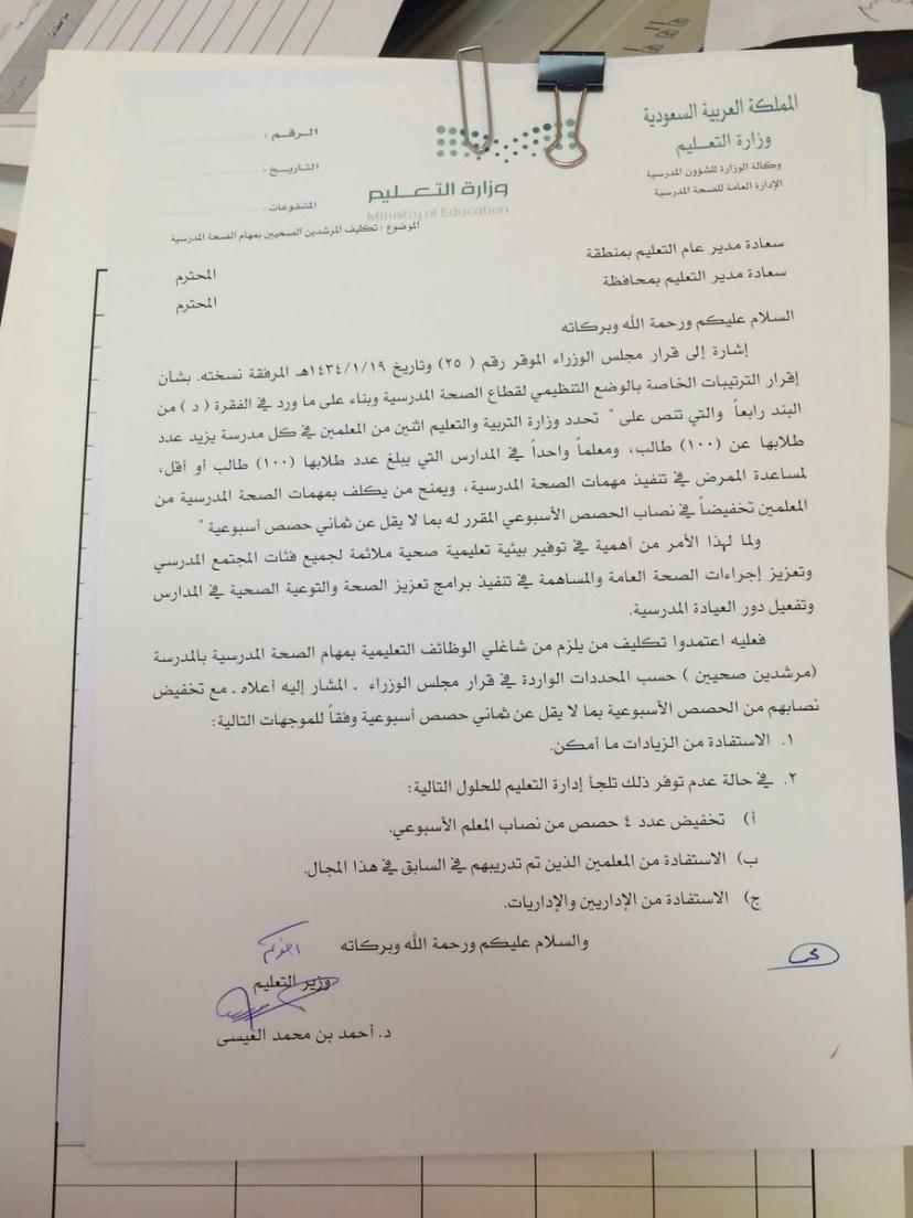 السلام عليكم ورحمة الله وبركاته تعميم تكليف المرشد الصحي بمهام الصحة المدرسية مع تخفيض نصابهلتحميل التعميم في الملفات المرفقة أخر الموضوع |