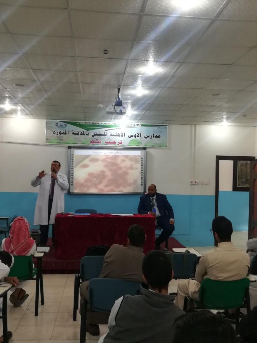 تم بحمد الله اليوم زيارة مجمع مدارس الأوس الاهلية بمراحلها الثلاث حيث تم مراجعة البيئة المدرسية ومعاينة المقاصف ثم التوعية الصحية حيث ألقيت محاضرة على طلاب الصف الثالث الثانوى عنوانها " الإيدز طاعون العصر " وذلك بمناسبة اليوم العالمي لمرض الإيدز والذي يحل في كل عام في اليوم الأول من شهر ديسمبر حيث تم الشرح مع تقديم عرض داتا شو اشتمل على التعريف بالمرض والفيروس المسبب له ومراحل المرض ووسائل العدوى به وطرق الوقاية منه وما هو العلاج الذي يمكن تقديمه حتى الآن والآثار الصحية والنفسية والمادية والاجتماعية للمرض ومعاناة المرضى من الوصمة والعزلة وبيان وجوب تصحيح نظرة المجتمع لهؤلاء المرضى والتعاون والتعاطف معهم كما تم بيان أسباب الوقوع في فاحشة الزنا التي تعد السبب الرئيس لهذا المرض ووسائل الوقاية منها . ولقد قمت برفع عرض الإيدز على النت لمن يرغب من الزملاء وهذا رابط التحميل AIDS.pptx - FileFactory |
