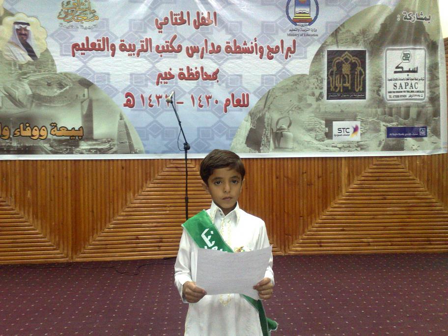 بسم الله الرحمن الرحيم كرم مدير مدرسة الخلفاء الراشدين الابتدائية بالثمد الاستاذ : زكي الاحمدي الطالب:متعب عبدالله الرشيدي والذي شرف المدرسة في الالقاء الفردي في ختام الانشطة الطلابية للعام الدراسي 1430-1431هـ على مستوى مكتب التربية والتعليم بخيبر وادارة المدرسة تتمنى له مزيدا من التقدم والنجاح الف مبروك الف مبروك في رعاية الله |