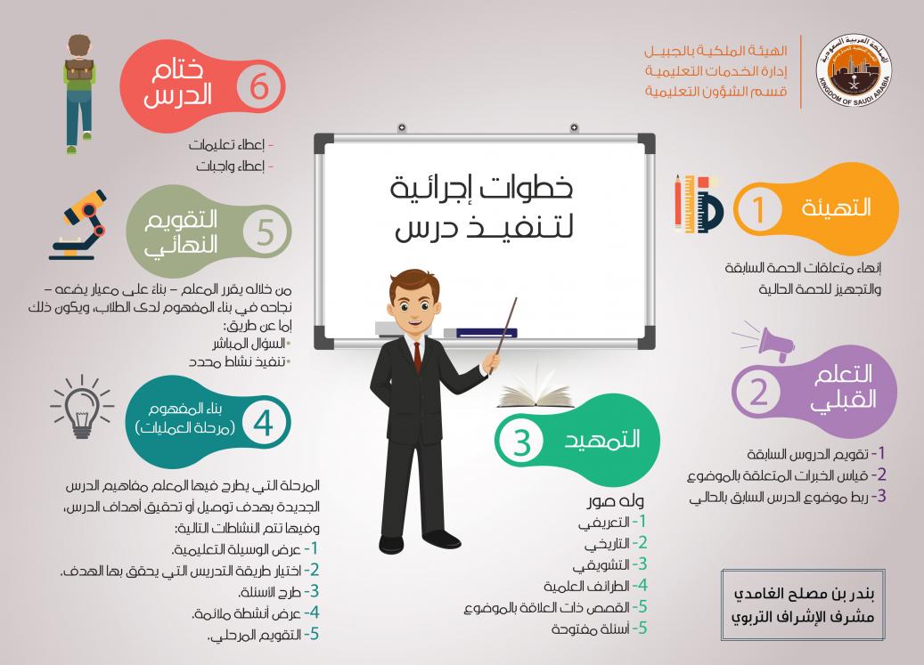 السلام عليكم ورحمة الله وبركاته إجراءات تنفيذ الدرس + مهارات التدريس السبع![]() أولا : مهارة التهيئة الذهنية وهي تهيئة أذهان الطلاب لتقبل الدرس بالإثارة والتشويق ، حيث يقوم المعلم بجذب إنتباه الطلاب نحو الدرس عن طريق عرض الوسائل التعليمية المشوقة ، أو طرح أمثلة من البيئة المحيطة بالتلاميذ . ![]() ثانيا: مهارة تنويع المثيرات هو عدم الثبات على شيء واحد من شانه أن يساعد على التفكير وإثارة الحماس . والتنويع بالمثيرات مهارة هامة في إيصال المعلومة . فاستخدام المعلم في كل لحظة من لحظات الدرس مهارة هو بمثابة زيادة في التحصيل الدراسي لدى الطلاب مع الحفاظ على اهتمام الطلاب في موضوع التعلم و يتحقق ذلك عن طريق تنويع المثيرات التالية : * الإيماءات : ويقصد بها إيماءات الرأس وحركة اليدين وتعبيرات الجسم بالموافقة أو العكس. * التحرك في غرفة الصف . * استخدام تعبيرات لفظية . * الصمت : ويقصد به الصمت الذي يتخلل عرض المعلم لموضوع معين . * تنويع الحواس . ممارسات تبعث الملل : * الصوت الرتيب . * الوقوف الثابت . ========= ثالثا : مهارة استخدام الوسائل التعليمية عند عرض الوسيلة التعليمية أمام الطلاب يجب أن يدرك المعلم الغاية من هذه الوسيلة ومدى ملائمتها لمستوى الطلاب وكيفية استخدامها ، ويجب على المعلم أن يجعل الطلاب يكتشفون تدريجيا أهداف الدرس من خلال هذه الوسيلة ، كما أن التربية الحديثة تهتم بالجانب الحسي عند الطلاب لأن من خلاله يبقى أثر التعلم . رابعا : إثارة الدافعية للتعلم يقصد بها إثارة رغبة التلاميذ في التعلم وحفزهم عليه . فوائدها :* تجعلهم التلاميذ يقبلون على التعلم . * تقلل من مشاعر مللهم وإحباطهم . * تزيد من مشاعر حماسهم واندماجهم في مواقف التعلم . استراتيجيات لإثارة دافعية الطلاب للتعلم : * التنويع في استراتيجية التدريس. * ربط الموضوعات بواقع حياة التلاميذ. * إثارة الأسئلة التي تتطلب التفكير مع تعزيز إجابات الطلاب . * ربط أهداف الدرس بالحاجات الذهنية والنفيسة والاجتماعية للمتعلم . * التنويع بالمثيرات. * مشاركة الطلاب في التخطيط لعملهم التعليمي. * استغلال الحاجات الأساسية عند المتعلم ومساعدته على تحقيق ذاته . * تزويد الطلاب بنتائج أعمالهم فور الانتهاء منها. *إعداد الدروس وتحضيرها وتخطيطها بشكل مناسب . * الشعور بمشاعر الطلاب ومشاركتهم بانفعالاتهم ومشكلاتهم ومساعدتهم معالجتها وتدريبهم على استيعابها . خامسا : مهارة وضوح الشرح والتفسير وهي إمتلاك المدرس قدرات لغوية وعقلية يتمكن بها من توصيل شرحه للطلاب بيسر وسهولة ، ويتضمن ذلك استخدام عبارات متنوعة ومناسبة لقدرات الطلاب العقلية . سادسا : مهارات التعـزيز مفهومه هو : * وصف مكافأة تعطى لفرد استجابة لمتطلبات معينة . * أو كل ما يقوي الاستجابة ويزيد تكرارها . * أو تقوية التعلم المصحوب بنتائج مرضية واضعاف التعلم المصحوب بشعور غير سار . أنواع التعزيز : يختلف باختلاف الأشخاص والمعلم يعتمد على الله ثم على خبرته في معرفة طلابه وصلاحية طرائق التعزيز التي استخدمها معهم . * التعزيز الإيجابي (اللفظي) كـ ( أحسنت – نعم أكمل – جيد ) للإجابة الصحيحة . * التعزيز الإيجابي (غير اللفظي) كـ ( الابتسامة – الإيماءات – الإشارة باليد أو الإصبع .. ) * التعزيز الإيجابي (الجزئي) تعزيز الأجزاء المقبولة من إجابة الطالب . * التعزيز المتأخر (المؤجل) كأن يقول المعلم لطالب هل تذكر قبل قليل قلت لنا .. يجيب … * التعزيز السلبي : إيقاف العقاب إذا أدوا السلوك المرغوب فيه بشكل ملائم * التجاهل والإهمال الكامل لسلوك الطالب التعزيز والطلاب الخجولين : الطلاب الخجولين الذين لا يشاركون في المناقشات الصفية إلا نادراَ بإمكان المعلم حل هذه المشكلة تدريجياً من خلال دمجه في الأنشطة الصفية. ومثال ذلك : * تكليفه بالإجابة على سؤال سهل نوعاً ما . * ابتسامة أو هزة رأس من المعلم إذا لاحظ أحد هؤلاء يصغي إليه أو ينتبه على ما يدور حوله في الصف. سابعا : مهارات الأسئلة واستقبال المعلم لإسئلة الطلاب تعد الأسئلة الصفية الأداة التي