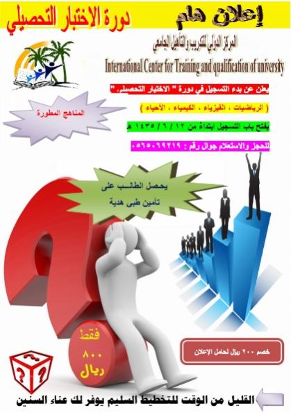 íÚáä ÇáãÚåÏ ÇáÚáãí ÇáÃÏÇÑí æÇáãÑßÒ ÇáÏæáí ááÊÃåíá æÇáÊÏÑíÈ ÇáÌÇãÚí Úä ÝÊÍ ÈÇÈ ÇáÊÓÌíá Ýí  ÏæÑÉ   ÇáÊÍÕíáí  ÇáãäÇåÌ ÇáãØæÑÉ (  ÇáÑíÇÖíÇÊ - ÇáßíãíÇÁ - ÇáÝíÒíÇÁ - ÇáÃÍíÇÁ  ) ÈÑÓã ÊÓÌíá ÞÏÑå 800 ÑíÇá  ¡  ßãÇ íÊæÝÑ ÚÑæÖ ÌíÏå ááãÌãæÚÇÊ æÇáãÏÇÑÓ æÇáãÄÓÓÇÊ ÇáÊÚáíãíÉ . ( íÍÕá  ÇáØáÈÉ ÇáãÔÊÑßæä Úáì ÊÃãíä ØÈí ÔÇãá áßá ØÇáÈ åÏíÉ ãä ÇáãÚåÏ ) ááÃÓÊÝÓÇÑ ÌæÇá ÑÞã 0565069219 ÊÚÞÏ ÇáÏæÑÉ Ýí ÌÏå  |